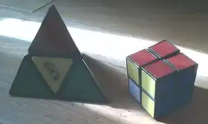 Pyraminx is the pyramid version of the Rubik's Cube. Pyraminxes come in 3 levels, A 2x2,3x3, and a 4x4. 2x2 is around the same difficulty as a mini cube (2x2). A 3x3 is around the same difficulty as Rubik's Cube (3x3). A 4x4 is around the same difficulty as a Rubik's Master Cube (4x4)