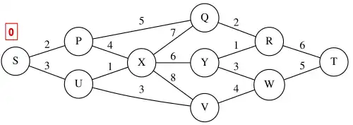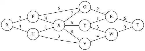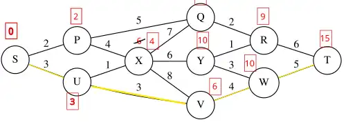 Route, SUVWT is a shortest path, SPQRT also is a shortest path (but this wasn't chosen for the demonstration).