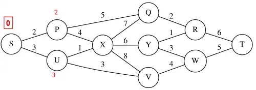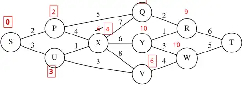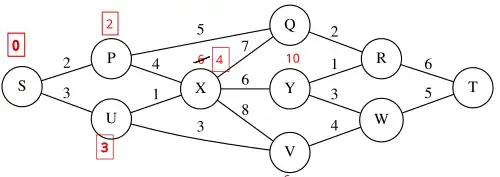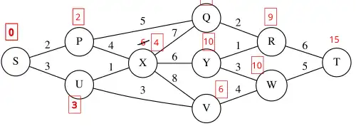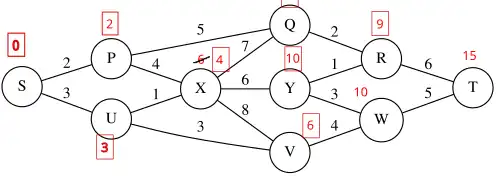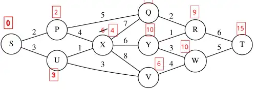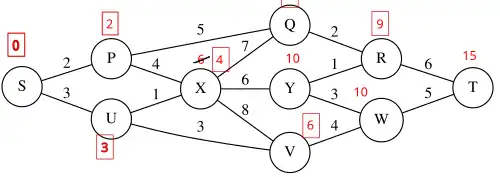2. For all nodes reachable from S, assign a T-label equal to their direct distances from S.