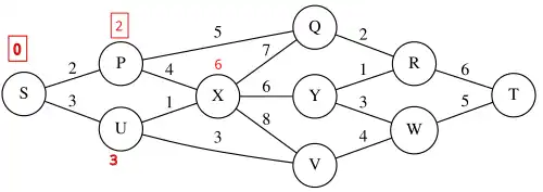 3. Select the node with the smallest T-label value, make this a P-label, this label marks the shortest distance from S to that node