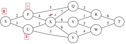 Make the lowest T-label a P-label, mark it's directly connected connected nodes with T-labels of their own, here X's T-label has been relabelled as 4 as a shorted route has been found.