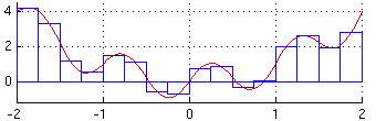 Doing definite integrals can be seen as just finding the area under a curve on a graph. You may have met elsewhere the idea of finding the area of complicated shapes by splitting them up into simpler shapes that we can easily calculate the areas of. We use a similar technique for numerical integration - we approximate the curve by a series of simple shapes and add up the areas of these to get a value for the integral.