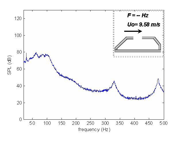 Flow induced tests performed over a range of flow velocities are helpful to determine the change in sound pressure levels (SPL) inside the car cabin as inflow velocity is increased. The following animation shows typical auto spectra results from a car cabin with the sunroof open at various inflow velocities. At the top right hand corner of the animation, it is possible to see the inflow velocity and resonance frequency corresponding to the plot shown at that instant of time.