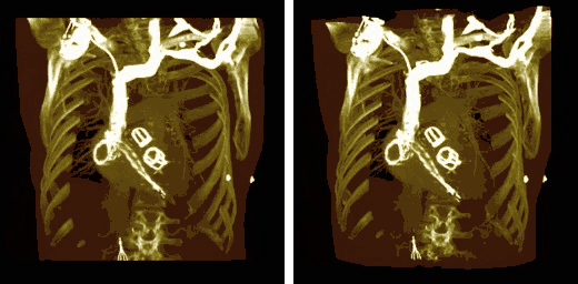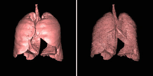 - Notice that internal features of each lung can be discerned when the opacity is reduced. Notice also that continued viewing of this type of transparency display can generate apparent reversal of the image rotation, similar to that noted for the 3D MIPs above. One method of overcoming this type of problem is to segment each lung, for instance. and to blend the results, as illustrated in Figure 5.32.