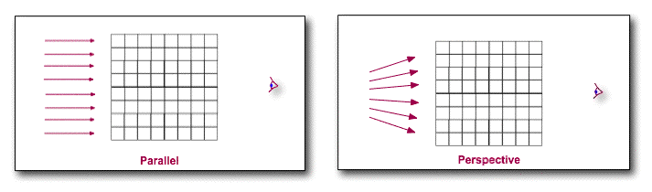 - Perspective projections can be generated by changing from the parallel lines used to generate the parallel projections to lines of voxels which diverge from an apparent point behind the volume at a distance such that the viewer of the display can visualize closer features of the image data as relatively larger than deeper features - see Figure 5.24. Notice that it is somewhat similar in principle to projection imaging using a small source as in general radiography.