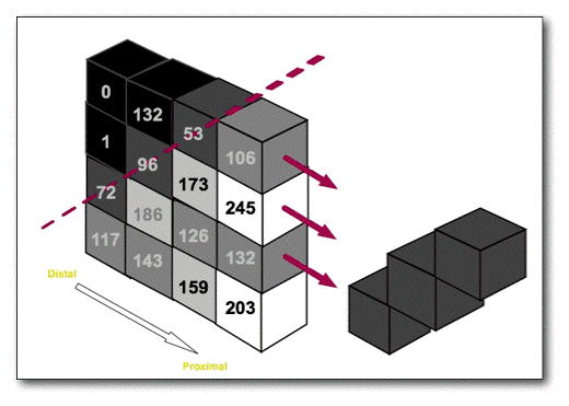 - The first two images in the second row show the result of what are called a Maximum Intensity Projection (MIP) and a Minimum Intensity Projection (MinIP), respectively. A MIP evaluates each voxel along each line of voxels through the volume to determine the maximum voxel value and forms an image using the values so determined for each line. A MinIP uses the minimum voxel values, as illustrated in Figure 5.15.