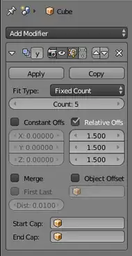 The cube will immediately become two cubes, but so close together that they look like a single cuboid. This is because the default settings for the Array modifier are to use a Relative offset of (X, Y, Z) = (1.0, 0.0, 0.0). Change these offsets to (1.5, 1.5, 1.5), so the copies are more widely separated at a more interesting angle, and increase the repetition count to 5.
