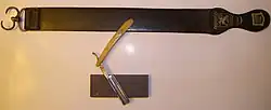 They are sharpened using a strop before each use. Strops are typically made from fine Russian horsehide, but cardboard is just as effective; try the back of a notebook or the inside of a cereal box. Most blades are double-hollowed, meaning that the blade is curved in such a manner that the optimal stropping angle is when both the blade's edge and spine press against the strop.