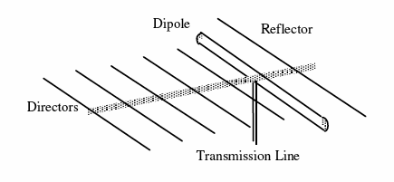 The directors are normally 0.4 to 0.45 wavelengths long and are spaced at 0.3 to 0.4 wavelengths in front of the dipole. An antenna will usually have 6 to 12 directors.
