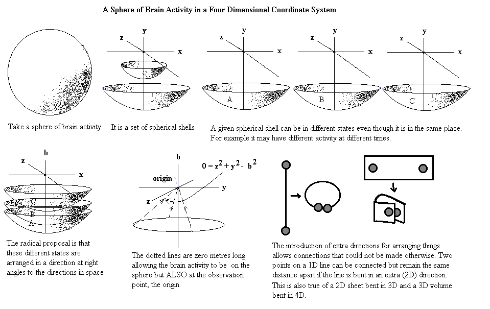 This equation describes both binding and simultaneity. It has an identical form to the Minkowski Light Cone Equation (see Physics for Consciousness Studies) and either the equation is describing some non-physical space or it's use in this context is a reinterpretation of Relativity Theory (specifically, time might have imaginary coordinates, see below). This equation is a theory because there is no way to determine that b=ct, the identity is assumed from the similarity of the two equations and their field of application. If equation (1) were correct the 'view' would be a small volume or shell of brain activity, probably in the thalamus. The 'view' would be sensitive to mechanical distortion because x,y,z refer to actual positions within a volume of brain. The equation can be tested by cyclically deforming potential sites in the thalamus and observing the response of subjects. Bilateral deformation would be required and the expected response, if the deformation were severe, would probably be one of the following: absence seizure, akinetic mutism or delirium (see Note 1).