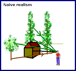 The illustrations show the difference between an actual 3D part of the world, 2D representations of that part of the world, conscious experience itself and naive realism.