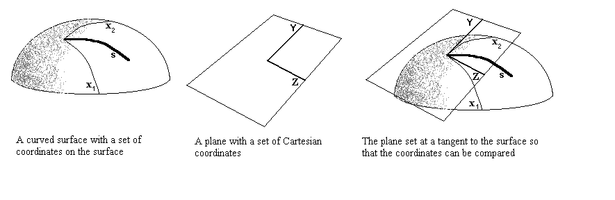 It is possible to use elementary differential geometry to describe displacements along the plane in terms of displacements on the curved surfaces: