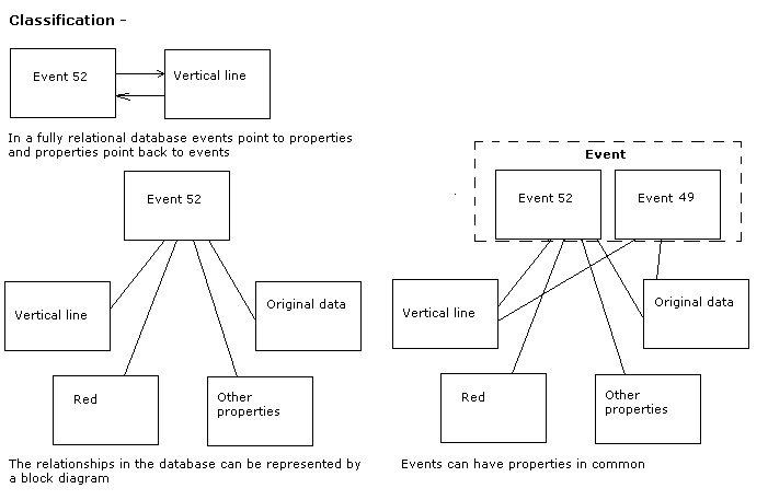 A database is a collection of signs. A fully relational database is a database arranged in related sets with all relationships represented by pointers or connections. In conventional usage a relational database is similar but more sophisticated, redundant relationships and wasteful storage being avoided. Conventional relational databases obey "Codd's laws". An hierarchical database only contains pointers that point from the top of a classification hierarchy downwards. Events and persistent objects are also known as entities, the output of filters related to entities are known as the attributes of the entity. In practice a system requires an event filter to record an entity (in a computer system the event filter is usually a single data entry form and the attributes are filtered using boxes on the screen to receive typed input).