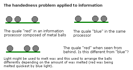 This argument also occurs when the physical structure of computing devices is considered, for instance a computing machine could be constructed from rolling steel balls. Would the steel balls at one instant possess the quale 'blue' and then, as a result of the movement of one ball to another position, possess the quale 'red'? Can an arrangement of balls really have qualia or are they absent? It is incumbent upon proponents of functional organisation to describe why identical balls arranged as O O OOO can be the quale red and yet those arranged as OOO O O can be the quale blue. They must also take into account Kant's "handedness problem": the balls OOO O O look like O O OOO when viewed from behind. Red and blue, as arrangements of things, would be identical depending on the viewing point. How can a processor have a viewing point when it is itself the steel balls?
