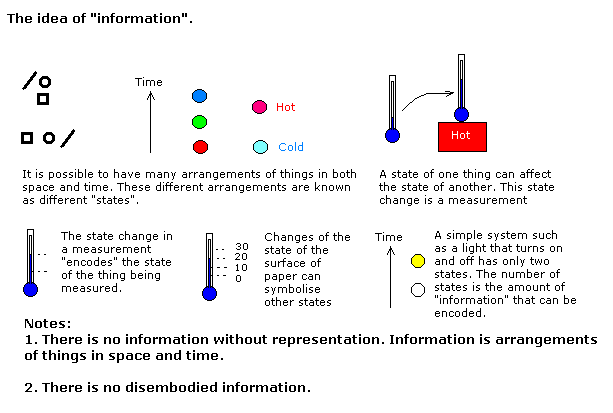 When one physical thing interacts with another a change in "state" occurs. For instance, when a beam of white light, composed of a full spectrum of colours is reflected from a blue surface all colours except blue are absorbed and the light changes from white to blue. When this blue light interacts with an eye it causes blue sensitive cones to undergo a chemical change of state which causes the membrane of the cone to undergo an electrical change of state etc. The number of distinguishable states that a system can possess is the amount of information that can be encoded by the system.