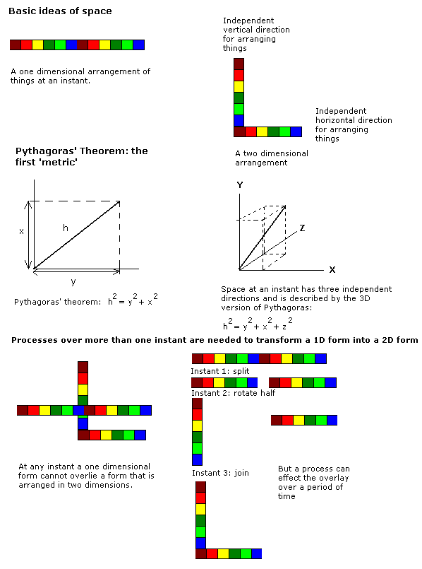 The advances in geometry in the nineteenth century showed that Pythagoras' theorem was a special case of a metric, an equation that describes displacements in terms of the dimensions available. In the twentieth century it was realised that time was another independent direction for arranging things that was interrelated to the other three dimensions. The world is now described as a four dimensional manifold.