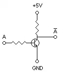 The NOT gate works by inverting the input. The TTL version of the NOT gate contains one transistor, seen below: