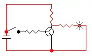 However, when the switch is hit, making the input high, the circuit is shorted and current flows directly from one terminal of the battery through the transistor, to the other terminal. This is illustrated further in the next figure: