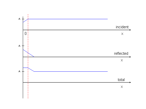 The sequence of wave reflection for incident, reflected and combined waves are illustrated below. Please note that the wave is traveling to the left (negative x direction) at the beginning. The reflected wave is ,of course, traveling to the right (positive x direction).