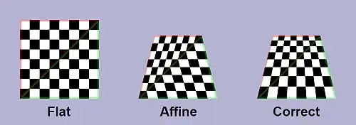 The interpolation described in the previous section can result in certain distortions if applied to scenes that use perspective projection. For the perspectively correct interpolation the distance to the view point is placed in the fourth component of the three vertex positions (, , and ) and the following equation is used for the interpolation:
