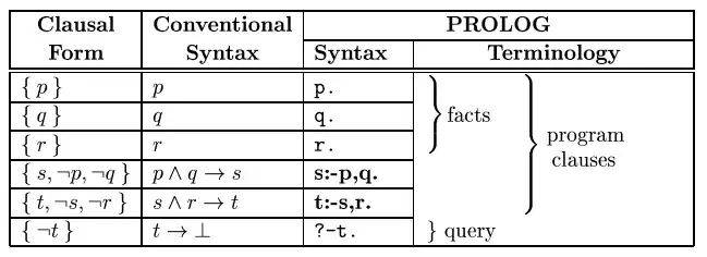 A clause with a single negated literal is called a query. The table below shows a comparison of the different notations. In PROLOG, to query a statement , the idea is to negate the statement () and to perform resolution with the set of known true statements. If a resolution refutation tree is found, the statement is implied by the program.