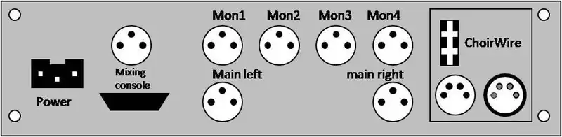 The data collector is the power supply for all distributed inputs and “collects” the music data from the right and left side of the physical data ring. It can be put in a 19’’ rack, for example, and mounted together with the power amplifier. It contains only connections: for power, for the remote mixing console (or laptop), then the sound outputs main and monitor channels and, of course, the connector for the ChoirWire distributed inputs. Of course, it is possible to build the mixing console and the data collector in one housing. (Then the main outputs are at the FOH – this is kind of taste.)