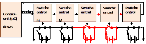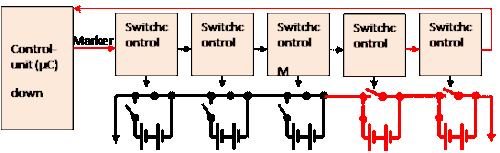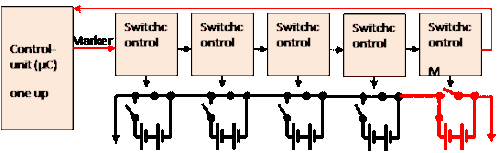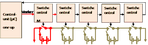In idle state, all switches of all battery packs are tristate and thus safe. For starting operation, the control head shall put out a "marker" signal and 100ms an "idle" signal to wake up the battery pack. The switching cell next to the control head will store this "marker" information.