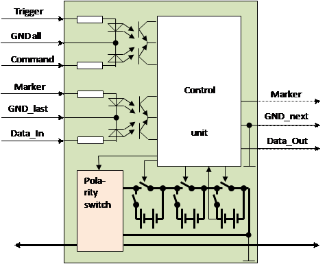 The signals "Marker" and "(Tx-)Data" loop through all AC battery blocks. The "Marker" signal is used to distinguish, which cell has to be switched on of off next time. The "Data" signal carries a serial protocol. With it, the control unit informs the battery packs about the actual mean current. Moreover, the control unit is informed about the state of all battery cells, which battery packs are used, their temperature, the maximum allowed current and so on.