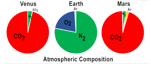 Take a deep breath. The air that you inhale is composed of a unique mix of gasses that form the Earth’s atmosphere. The Earth’s atmosphere is the gas-filled shell around a sphere representing the outer most portion of the planet. Understanding the unique mix of gasses within the Earth’s atmosphere is of vital importance to living organisms that require the presence of certain gasses for respiration. Air in our atmosphere is a mix of gasses with very large distances between individual molecules. Although the atmosphere does vary slightly between various regions of the planet, the atmosphere of Earth is nearly consistent in its composition of mostly Nitrogen (N2), representing about 78.08% of the atmosphere. The second most abundant gas in Earth’s atmosphere is Oxygen (O2) representing 20.95% of the atmosphere. This leaves only 0.97%, of which 0.93% is composed of Argon (Ar). This mix of Nitrogen, Oxygen and Argon is very unique among the solar system especially compared to neighboring planets, as Mars has an atmosphere of 95.32% Carbon dioxide (CO2), 2.6% Nitrogen (N2) and 1.9% Argon (Ar). While Venus has an atmosphere of 96.5% Carbon dioxide (CO2), 3.5% Nitrogen (N2) and trace amounts of Sulfur dioxide (SO2). Earth’s atmosphere is strange in its abundance of Oxygen (O2) and very low amounts of Carbon dioxide (CO2). However, evidence exists that Earth began its early history with an atmosphere similar to Venus and Mars, an atmosphere rich in carbon dioxide.