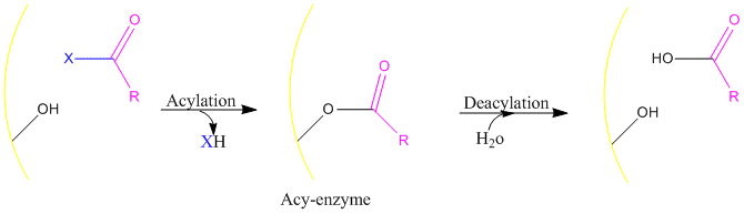 This illustrates the covalent catalysis of chymotrypsin. The first step is the acylation, which forms the acyl-enzyme intermediate. Then the acyl-enzyme intermediate goes through deacylation converting back to its original free enzyme form.