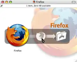 Double click on the compressed Disk Image to mount it. Drag the Firefox application icon to the "Applications" folder on your hard drive. Do not double-click the Firefox icon inside the Disk Image; doing so can cause a program hang. To make Firefox always appear in the dock, drag the icon from the "Applications" folder to the dock.