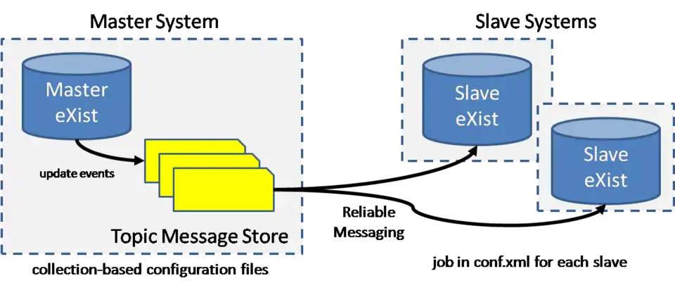 - Slaves - a collection of one or more specially configured eXist instances that automatically receive updates when changes occur on the master. Each slave is considered a "subscriber" to the change events on the master.