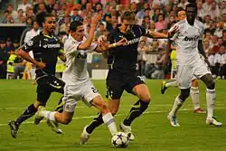 His league debut came on 29 August in a 0–0 draw against Mallorca.[30] On 18 September, Di María scored his first league goal for Real Madrid in their 2–1 away win over Real Sociedad.[31] Ten days later, he scored his first goal in the UEFA Champions League against Auxerre in a 1–0 victory.[32] He scored a controversial first goal against Sevilla on 19 December. Days later, Di María assisted Karim Benzema's two goals and Cristiano Ronaldo's goal in an astonishing 8–0 drubbing of Levante on 22 December. In the second leg of the Champions League round of 16 against Lyon, he scored the third and final goal in a 3–0 win to send Real Madrid through to the quarter-finals for the first time in seven years.[33]