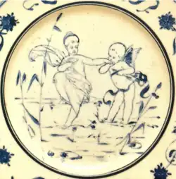 However, in Klein's expression there was no trace of the pedantry of German historicism and the copying of templates. Although he was a sculptor by training, he was also quite skilled in drawing, which was decorative and lyrical at the same time. This is especially shown in his Amoretti series from 1878 and 1879. Typical for this series are plates with a rim divided by a stripe and decorated with a Renaissance ornament on the rim, while in the recipient are drawn amoretti in pairs, shown in genre scenes. All this was done in cobalt sepia. The amoretti motif was especially popularized by Hans Makart, a popular Viennese painter at the time, whom Teréz and Julia Zsolnay visited in his Viennese atelier, and Klein even made a female portrait in his style. Klein also painted other types of vessels, so, for example, he painted flasks with scenes from folk life. There are several of his flasks with depictions of the wedding party.[7]