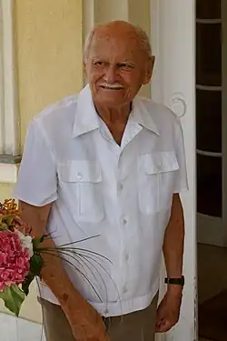 Árpád Göncz was born on 10 February 1922 in Budapest into a petty bourgeois family of noble origin as the son of Lajos Göncz de Gönc (1887–1974), who worked as a post officer, and Ilona Haimann (b. 1892). The Roman Catholic Göncz family originated from Csáktornya, Zala County (today Čakovec, Croatia), where Göncz's great-grandfather, Lajos Göncz Sr. was a pharmacist. He later participated in the Hungarian Revolution of 1848 and following the defeat, he was sentenced to nine years in prison.[2] Árpád Göncz's father, Lajos Göncz was also a successful tennis player, who participated in the 1924 Summer Olympics, where he was defeated by René Lacoste in men's singles in the second round.[3] Árpád Göncz's parents divorced when he was six years old, thus his relationship with his father became tense in the following years.[4] Göncz's mother, who was a Unitarian, was born in Transylvania, she had Jewish and Székely roots. She became an orphan as a child and after a brief spell in an orphanage, she was raised by the merchant Báthy family from Budapest.[4]