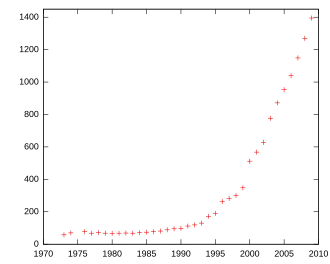 Early on, the organization had ambitious plans for building a temple, getting a burial ground, and dividing the land into goðorð, led by individual goðar (a nomenclature borrowed from the political system of the Icelandic Commonwealth).[32] However, membership in the organization did not increase as quickly as these goals would have necessitated. In 1973, Ásatrúarfélagið had 58 registered members, in 1974 it had 70, and in 1976 it had 77. As its leaders realized that the organization's more ambitious goals could not be quickly achieved, the society settled down to a low level of activity.[32][33] In 1983, a blót had not been held for three years, but one was arranged to provide the makers of a documentary with material.[34][35]