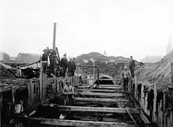 Covering the first section of the canal in 1896: A traction engine is used to pump away the water