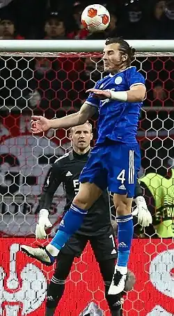 Söyüncü after heading the ball during a Leicester City match in 2021