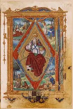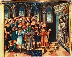 The "Master of the Puys de Rouen" (loosely, "... of the Hills of Rouen") was engaged for several projects by Étienne Colaud, notably on the so-called "Rouen Manuscript", the work for which he was the principal illustrator, and from which he acquires the name by which he is generally known by scholars.[11] He was active in Paris between 1520 and 1540. His style is characterised by exaggeratedly square-jawed figures, firm outlines and voluminous architectural framing. In addition to the works he produced for Colaud, several other significant manuscripts are attributed to him, including an Evangelion for the Duprat family, a Book of Hours which recently appeared on the London art market through a dealer called Sam Fogg,[10] and another Book of Hours sold by the specialist dealer "Les Enluminures" in 2008. The German art historian Eberhard König has suggested this last work might be attributed to Henri Laurer, an artist from Paris who moved to Mirepoix (far away, south of Toulouse) but the attribution was not endorsed by other specialist scholars.[1]