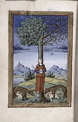 He also bases some of his illustrations on miniatures by the Flemish artist Noël Bellemare, with whom, he collaborated on the "Roman de Lérian et Lauréolle".[1] These influences demonstrate that, when it came to artistic style, Colaud continued to nurture close links with the leading Paris-based illuminators of the time. Alone among these, only the anonymous "Maître de François de Rohan" seems not to have enjoyed a relationship of "mutual influence" with Colaud, even though he is believed to have completed (at least) one manuscript that Colaud had started. As for the workshop-studios of the "Maître des Entrées parisiennes", another well-regarded illuminator whose actual name remains unknown, the influence was in the other direction. Scholars adduce a number of instances where work produced by the "Maître des Entrées parisiennes" or his assistants was clearly influenced by the work of Étienne Colaud.[1][6]