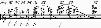[...] The expression of a restless fierce, almost savage, grim raging: The image of tossed up ocean waves breaking on a rocky coast, thundering and foaming, their spray splashing upwards, licking the rocks and quickly flowing down again. [...] the fascinating interplay of rushing, roaring, murmuring, rumbling, flowing, climbing, jumping, crashing, falling, all this without a single point of rest. [...] Bar 27: The playing waves seem to rest shortly on a projecting rock terrace and run for a short while in the plain (30–33), they fall step by step, suddenly drowned out by a new thunderous rush (33), which in its precipitous downfall dissolves into colored foam (35, 36). [...] Bars 41 - 44: A surging up and down with both hands; high up sends a wave its splash (44) and in mighty thunderous crash (ff con fuoco) the wave collapses on itself, running out on level plain (47–50), but always, even in ebbing, revealing its power through occasional sforzato chords of the left hand.[12]
