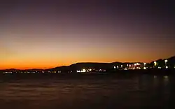 The town reaches approximately 100 m (330 ft) at its highest elevation,[19] with mountainous terrain surrounding it to the north within the peninsula. This is a result of Turkey's fault block features – the convergence of the Anatolian Plate against that of the Aegean Sea Plate – and the wide range of mountains in western Turkey and the Aegean Region surrounding the Büyük Menderes River to the south, collectively referred to as the Menderes Massif.[20]