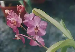 × Aeridovanda, abbreviated in trade journals Aerdv,[1] is an intergeneric hybrid between the orchid genera Aerides and Vanda (Aer x V). It is now the accepted name for several former hybrid genera, since Ascocentrum and Neofinetia are now both synonymous with Vanda.[2][3]