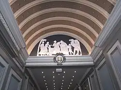 Østergade 13 originates in two separate buildings. The western building was constructed prior to the Copenhagen Fire of 1728. It was later subject to alterations in 1773. The eastern building was constructed before 1749. The two buildings were both adapted in the 1830s and finally to their present appearance in 1856. The present building is a fourwinged complex surrounding a central courtyard. The central main entrance opens to a long corridor. It features a lunette with a silhouette of a grouop of people and the house number just inside the main entrance.[1]