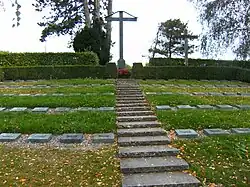 In April 1946, the French occupationary forces brought interned national socialists and former guards to recover the bodies from the mass grave. An investigation revealed that 10 of the 97 victims had fatal gunshot wounds. The others had died of weakness, starvation, abuse, or accidents while working in the tunnels. The dead were buried after a nightly vigil in the city center of Überlingen on April 9, 1946, at the newly established concentration camp cemetery Birnau, not far from the pilgrimage church Birnau.[5] The cemetery, redesigned in 1962 by the German War Graves Commission, was the target of desecration in October 1992, during which all gravestones were overturned and a monument was defaced with swastikas.[6] The perpetrators were caught and sentenced. Since the fall of 2001, a plaque at the cemetery has provided information about the names of the prisoners buried there, as far as they are known.