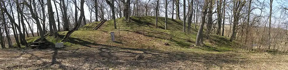 The Ąžuolpamūšė hillfort, also known as the Dabužiai hillfort, is an archaeological site in Pasvalys district municipality, Lithuania near the village of Ąžuolpamūšė. It includes a Semigallian hillfort and a settlement site. It is located on a high point by the confluence of Tatula and Ūgė rivers.[1][2]