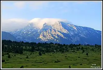 Čvrsnica (Serbian Cyrillic: Чврсница, pronounced [t͡ʃʋr̩snit͡sa]) is a mountain in the Dinarides of Bosnia and Herzegovina, located in northern Herzegovina. Most of the mountain is located in the Herzegovina-Neretva Canton municipalities of Mostar and Jablanica, while a small part of it, around 10%, is located in the municipality of Posušje.[2] Pločno is the highest peak at 2,228 metres above sea level.