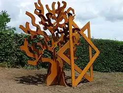 In September 1952, the Union of Jewish Communities of Yugoslavia unveiled five monuments to the victims of the Holocaust in Belgrade, Zagreb, Sarajevo, Novi Sad and Đakovo.[38] Following Croatia's independence from Yugoslavia, the site of the former camp was turned into a gas station.[39] A commemorative ceremony is held at the site every year on the first Sunday in June. The commemoration also encompasses the nearby cemetery in which the camp detainees who died were buried. The cemetery is unique in that it is the only burial site in Europe where victims of the Holocaust were interred under their first and last names and not merely their inmate number.[40] There are 569 camp victims buried in the cemetery.[26] On this basis, the historians Jens Hoppe and Alexander Korb have concluded that the camp's mortality rate amounted to nearly 19 percent.[19] In June 2013, a sculpture titled Peace in Heaven, by Croatian-born Israeli sculptor Dina Merhav, was unveiled in Đakovo to commemorate those who were interned at the camp.[41]