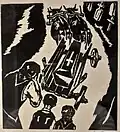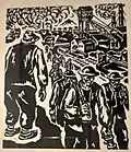 After returning to Belgrade, he created a set of graphics titled Blood-soaked Gold (Krvavo zlato) with the aim of displaying the lives of Yugoslav miners and workers. Although the collection was finished, he was unable to find a printer in Belgrade who would print his work. He printed 10 copies of the collection in his studio in 1936. With the help of architecture student Voja Midić, he reached printer Jovan Luks from Stari Bečej, who agreed to print the collection.[12] In January 1937, the first 250 copies were printed, and soon after, a second edition of 1,000 copies was published, which the writer Jovan Popović wrote the foreword for. The map of graphics depicting the difficult daily life of miners and arduous work, as well as the dissolute life of profiteers, was banned by the Belgrade City Administration in February of 1937.[1][13]