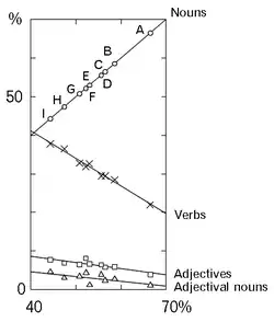 The horizontal axis (in Ōno's formulation) is arbitrary, and should not be interpreted as time. The graph in the re-formulation by Mizutani is more easily interpreted, and shows a scatter plot of nouns versus other word classes.